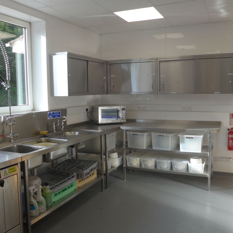 The Main Hall kitchen has recently (September 2024) been refurbished. It has a range cooker, a microwave, a hot water urn, a warming cabinet, a commercial dishwasher and a domestic fridge. It has crockery, cutlery and glassware to serve a meal to more than 100 people.